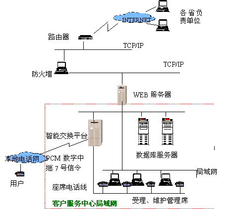 數(shù)據(jù)通信局的客戶遍布全國各地,建立一個覆蓋全國的客戶服務網絡勢在必行,因此我公司為之構建了數(shù)據(jù)通信局客戶服務系統(tǒng),全國各地的各個客服中心的數(shù)據(jù)可以通過專線連接,語音也可以通過VOIP用數(shù)字專線連接,以降低長話費用。該系統(tǒng)的投入使用,不但滿足了數(shù)據(jù)局為全國各地客戶服務的需要,而且可以收集客戶信息,不但降低了辦公費用,而且有利于擴大市場分額。數(shù)據(jù)通信客戶服務中心的主要目的是解決對全國大客戶的業(yè)務咨詢與申辦、障礙申告、投訴與建議的集中管理以及處理控制,系統(tǒng)采用800號接入,以一個小型的交換設備為座席電話分配點,客戶撥入的電話,經小型交換設備分配到空閑的座席上。