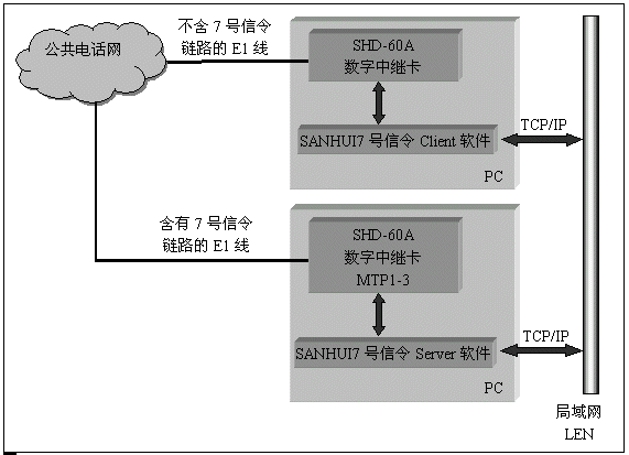 數(shù)字中繼卡上的DSP完成7號信令MTP第一至第三層的信令鏈路處理,由驅(qū)動軟件完成TUP和ISUP層的協(xié)議處理,包含有7號信令鏈路的微機(jī)作為server,通過TCP/IP協(xié)議為其它不包含信令鏈路的client提供接續(xù)控制。