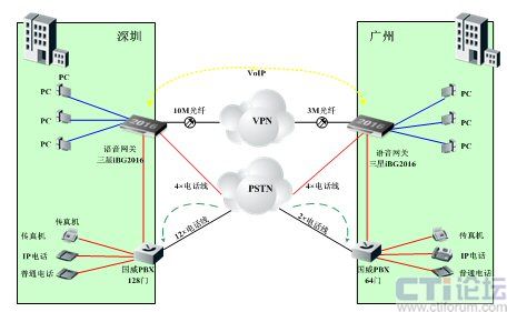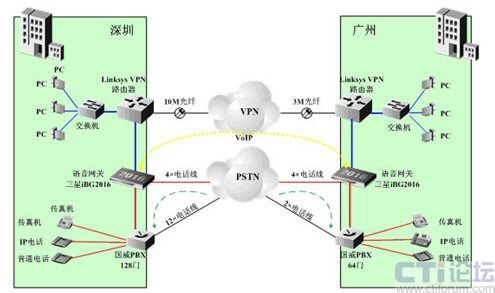 A公司總部設(shè)在深圳,在廣州有分公司。深圳總部目前已有10M光纖到樓作為總出口帶寬,已安裝1臺支持VPN功能的Linksys路由器;語音方面,已申請了16條電話線,并安裝1臺國威128門PBX;廣州也引入了3M光纖作為出口帶寬,和6條電話線作為PSTN外線,已安裝1臺支持VPN功能的Linksys路由器和1臺國威64門PBX。深圳、廣州兩地公司已建立了VPN隧道,以提供有安全保障的數(shù)據(jù)網(wǎng)絡(luò)平臺。