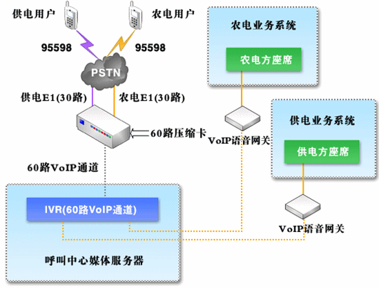 對(duì)于呼叫中心系統(tǒng),由95598特別號(hào)碼統(tǒng)一接入,并且在供電呼叫中心系統(tǒng)與農(nóng)電呼叫中心系統(tǒng)之間采用中繼方式(模擬中繼或者數(shù)字中繼,視農(nóng)電方實(shí)際情況而定)進(jìn)行話路連接,同時(shí)保證系統(tǒng)接入容量及其他資源能夠滿足統(tǒng)一的要求;在自動(dòng)語音菜單中,分別設(shè)立供、農(nóng)電用戶層,用戶可以自行區(qū)分、選擇,對(duì)于農(nóng)電用戶在確定用戶類型之后,通過中繼將話路轉(zhuǎn)接到農(nóng)電方呼叫中心系統(tǒng)。