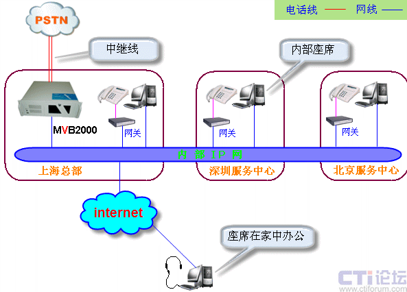 在技術(shù)上,MVB2000 的語音業(yè)務(wù)通過電信運營商的模擬或者數(shù)字中繼線路接入,數(shù)據(jù)業(yè)務(wù)都通過局域網(wǎng)或者互聯(lián)網(wǎng)使用TCP/IP協(xié)議傳送,解決了呼叫中心中大量數(shù)據(jù)傳送的需求,請看下面的網(wǎng)絡(luò)組織結(jié)構(gòu)圖: