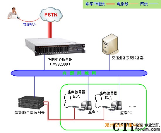 鄭州交運(yùn)服務(wù)熱線采用暢信達(dá)通信MVB2000系統(tǒng)作為交換平臺(tái),采用企業(yè)級(jí)智能路由語(yǔ)音網(wǎng)關(guān)結(jié)合話機(jī)作為座席終端,系統(tǒng)共接入數(shù)字中繼線4條(4E1),座席分機(jī)90臺(tái),系統(tǒng)通過(guò)內(nèi)部局域網(wǎng)組網(wǎng),系統(tǒng)架構(gòu)形式如下: