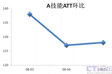 我們選擇話術(shù)簡(jiǎn)單的“A技能”來(lái)分析,分別取3~5月的A技能ATT統(tǒng)計(jì)數(shù)據(jù)進(jìn)行環(huán)比(如下圖2):