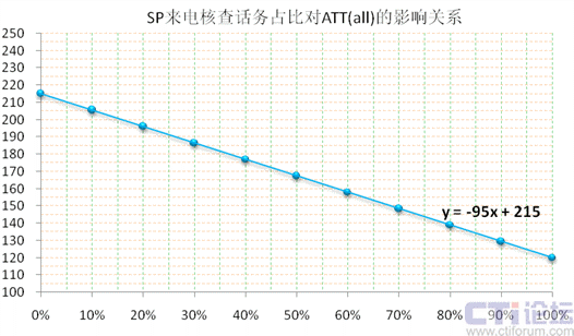 我們把話務(wù)構(gòu)成簡(jiǎn)單化,假設(shè)只有“來(lái)電核查”和“Inbound”兩大隊(duì)列,在上下6%的波動(dòng)范圍內(nèi),取ATT(sp)=120秒,ATT(in)=215秒,“SP來(lái)電核查”話務(wù)占比=x,則“Inbound”話務(wù)占比=1-x,ATT(all)=y(tǒng),整體通話均長(zhǎng)y與“SP來(lái)電核查”話務(wù)占比x存在如下線性關(guān)系:(下圖13)