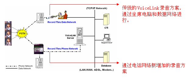 隨著通過(guò)電話網(wǎng)絡(luò)的Voicelink錄音方案的提高,Voicelink錄音不僅適用于有座席計(jì)算機(jī)和數(shù)據(jù)網(wǎng)絡(luò)的呼叫中心,也適用于只有單純電話而沒(méi)有計(jì)算機(jī)的呼叫中心。在一個(gè)單一的平臺(tái)內(nèi),Voicelink可根據(jù)客戶的商業(yè)需求及企業(yè)資源的有效性,向客戶提供靈活多樣的錄音方案。