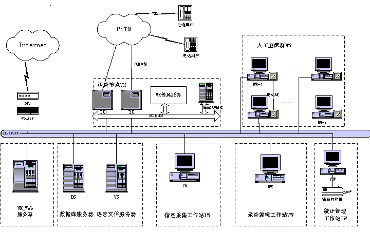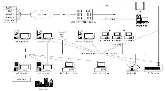客戶服務中心系統(tǒng)包含智能排隊機(含接入服務器)、核心服務器CCS、交互式語音應答系統(tǒng)IVR、語音傳真服務器、業(yè)務服務器、工作流服務器、數(shù)據庫服務器、Internet/Intranet服務器、人工座席、尋呼機接口,手機短消息接口等組成。如下圖所示為Runsun呼叫中心系統(tǒng)結構圖: