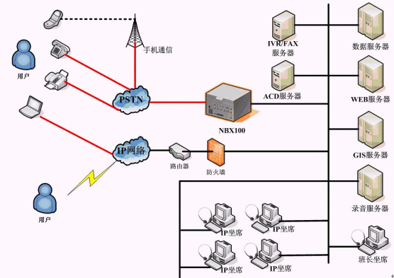 求助中心熱線系統(tǒng)采用華為-3COM 的 NBX100 網(wǎng)絡交換機作為呼叫接入設備,基于純IP交換技術,座席電話全部采用IP話機,部署方式靈活。求助中心系統(tǒng)主要負責受理市民投訴,并派發(fā)到相關二級網(wǎng)絡單位;網(wǎng)絡單位系統(tǒng)主要負責處理中心下發(fā)的投訴單據(jù),并進行反饋,同時,網(wǎng)絡單位也可自行受理投訴,并進行相應的上傳和下發(fā),多級網(wǎng)絡單位之間可實現(xiàn)級聯(lián)。為了簡化單據(jù)中轉流程,求助中心系統(tǒng)在網(wǎng)絡派單的基礎上,還結合自動傳真、短信群發(fā)等技術,提供了自動傳真派單、自動短信派單等多種單據(jù)派發(fā)功能,極大的提高了單據(jù)處理效率。