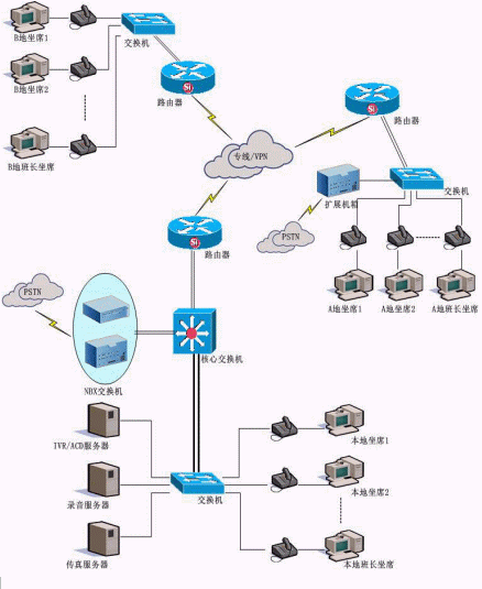 可以從不同的地區(qū)接入PSTN,即可以集中受理也可以通過由不同的坐席組分別受理。