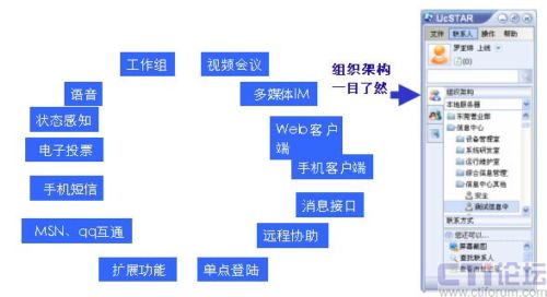 UcSTAR :Unified Communication Star,是深圳市擎旗信息技術有限公司推出的企業(yè)級融合通信平臺。是融合多種通訊手段(IM、文件、視頻、語音、EMAIL、SMS、電話、VOIP、MSN/QQ互通),融合企業(yè)的多種應用系統(tǒng)緊密集成(OA、CMS、ERP、EIP、Portal、網站、應用軟件),交流對象和交流內容可管理,可控制,可擴展,輕松實現(xiàn)部署企業(yè)的統(tǒng)一工作平臺。 UcSTAR能統(tǒng)一消息、統(tǒng)一溝通、統(tǒng)一管理、隨意選擇多種溝通手段,深航一直在找這樣的一種產品,公司信息部門從上到下給予極高的重視,商務的過程也都開了綠燈,一路順暢。