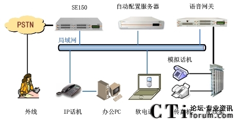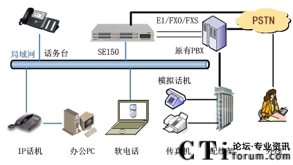 此方案適用于已經(jīng)部署了傳統(tǒng)PBX的企業(yè)。要求企業(yè)部署好數(shù)據(jù)網(wǎng)絡(luò),如果采用模擬終端,則企業(yè)的各個辦公點需要先將網(wǎng)絡(luò)線路和電話線路部署到位,同時企業(yè)原有的PBX要預(yù)留與SE150對接的接口。