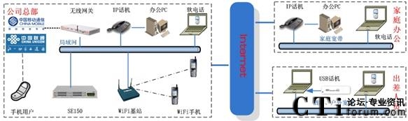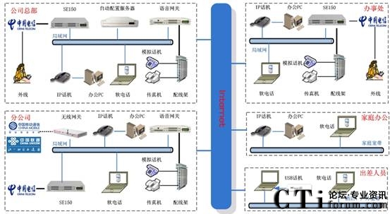 此方案適用于具有“移動辦公、頻繁出差、家庭辦公”需求的企業(yè)。系統(tǒng)要求企業(yè)內(nèi)部部署好數(shù)據(jù)網(wǎng)絡(luò),如果采用模擬終端,則企業(yè)的各個辦公點需要先將網(wǎng)絡(luò)線路和電話線路部署到位。如果需要應(yīng)用WIFI終端,則需要部署WIFI網(wǎng)絡(luò)。