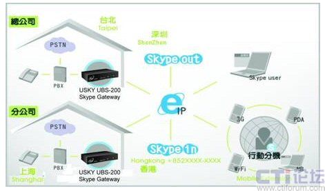 本公司新推出USKY UBS-400(4 ports)/UBS-200(2 ports) Skype Gateway,是專為企業(yè)用戶所設計的外接式Skype網(wǎng)關(guān)。只須將原有電話交換機(PBX)連接上我們的USKY UBS-400/UBS-200,企業(yè)用戶無需改變撥號方式,便可輕松透過桌上電話撥打或接聽Skype電話,將傳統(tǒng)電話提升為網(wǎng)絡電話(VoIP),既簡單又方便!有效幫助企業(yè)用戶增加通話效率,更能大幅減少通話費。