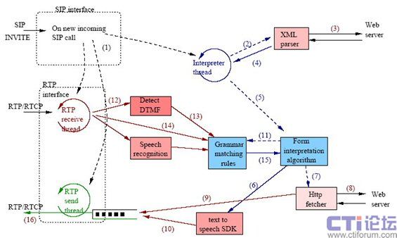 1. 當(dāng)瀏覽器接收到一個(gè)新進(jìn)來(lái)的SIP呼叫后,它創(chuàng)建三個(gè)不同線(xiàn)程:RTP接收線(xiàn)程、RTP發(fā)送線(xiàn)程和VoiceXML解釋器線(xiàn)程。RTP接收線(xiàn)程從主叫方接收媒體數(shù)據(jù)包并調(diào)用DTMF檢測(cè)模塊;RTP發(fā)送線(xiàn)程將媒體數(shù)據(jù)包以流的方式發(fā)送給主叫方。一個(gè)單獨(dú)的發(fā)送線(xiàn)程幫助維護(hù)外出數(shù)據(jù)報(bào)的固定帶寬(比如針對(duì)G.711音頻的64