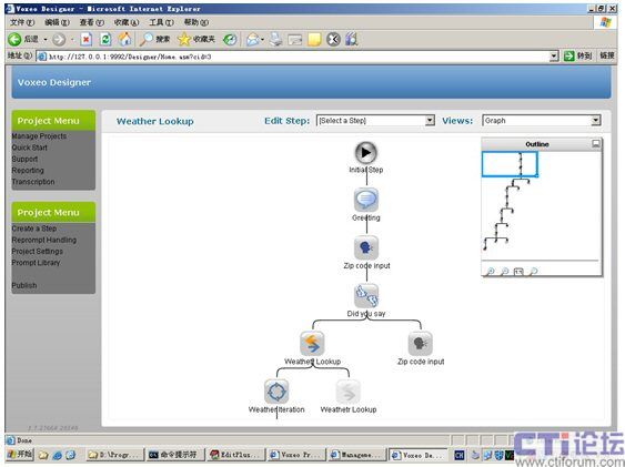Home,在打開(kāi)的Voxeo Prophecy網(wǎng)頁(yè)中點(diǎn)擊Prophecy Designer即開(kāi)始了我們創(chuàng)建VoiceXML項(xiàng)目的輕松之旅。該設(shè)計(jì)工具將整個(gè)VoiceXML應(yīng)用以圖表或樹(shù)狀結(jié)構(gòu)直觀(guān)地呈現(xiàn)給開(kāi)發(fā)者,可以方便地控制和修改其交互流程,如圖3所示。