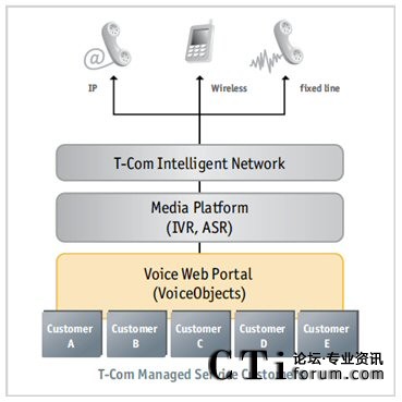 T-Com在2000年進(jìn)入競爭激烈的受托管理業(yè)務(wù)市場,并且很快從一個(gè)自產(chǎn)IVR系統(tǒng)過渡到開放標(biāo)準(zhǔn)的VoiceXML平臺(tái)。T-Com的標(biāo)語——“讓生活簡單”——證明了要求給它的客戶及其每天1,000,000個(gè)呼叫提供7x24、可擴(kuò)展的和可靠的受托管理電話服務(wù)。但是,T-Com很快意識(shí)到需要額外的技術(shù)來補(bǔ)充這個(gè)新的VoiceXML平臺(tái)。