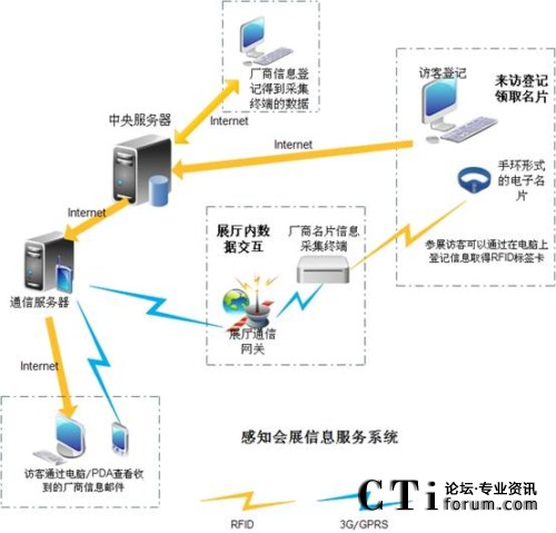 SEISS的基本部件:基于RFID技術(shù)制作的參展/巡展電子名片,帶3G/GPRS(也可使用WIFI等其他的傳輸方式)的感應(yīng)收發(fā)裝置,參展企業(yè)的電腦客戶端服務(wù)軟件,會(huì)展文件服務(wù)器。
