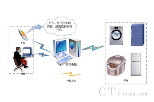 家電遠控系統(tǒng)的原理是利用電腦或者手機的電源管理系統(tǒng),來管理用戶終端軟件管理電源的開關(guān)、定時、預(yù)設(shè)時間等,利用互聯(lián)網(wǎng)或者手機網(wǎng)絡(luò)把信號傳輸?shù)郊彝ル娔X,家庭電腦當作小型服務(wù)器或者信號轉(zhuǎn)發(fā)點,把信號利用藍牙、zigbee、wifi等無線傳輸?shù)街付ǖ碾娫床遄,當然每個電源插座都要有相應(yīng)的信號接收模塊實現(xiàn)和家庭電腦的信號傳輸,實現(xiàn)了對電源的管理功能。家電遠控終端軟件嵌入語音合成軟件,利用合成語音報讀預(yù)設(shè)的提醒內(nèi)容和時間提醒,具有危急情況下的報警功能。當然如果我們是在家里,可以直接用手機通過藍牙對電源插座進行管理,或者通過家庭電腦進行管理。如圖所示: