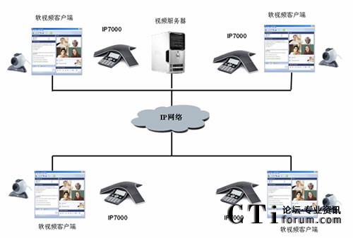 用戶現(xiàn)階段采用V2軟件視頻會議系統(tǒng),但現(xiàn)有的設(shè)備無法解決大型會議室的聲音處理問題。故新增PolycomSoundStation IP 7000音頻會議終端,并通過Polycom專有的計算機呼叫工具包使其與PC機相連,解決V2的軟件視頻會議系統(tǒng)大型會議室的聲音處理問題。