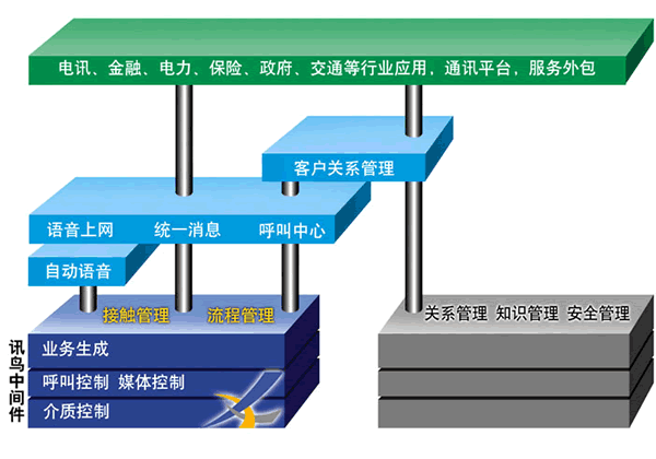 而要支撐這些復(fù)雜的應(yīng)用,中間件應(yīng)該可以進(jìn)行接觸管理、流程管理。和目前已有的關(guān)系管理、知識管理、安全管理結(jié)合,可以全方位的支撐應(yīng)用系統(tǒng)。訊鳥中間件就是這樣的中間件,它是建立在分布式計算環(huán)境上,可以控制多種通訊設(shè)備,支撐生成多種業(yè)務(wù)應(yīng)用軟件的軟件。它可以支持語音網(wǎng)的交互,因特網(wǎng)的交互,支持呼叫和數(shù)據(jù)的同步傳輸。它支持工作流程的生成,而不用了解一個工作流程是如何在不同的設(shè)備上運(yùn)行。同時,它的業(yè)務(wù)描述語言是用中文和圖標(biāo)表達(dá),易于和業(yè)務(wù)接軌,方便系統(tǒng)集成商、最終客戶,給系統(tǒng)分析員提供優(yōu)秀的設(shè)計工具和運(yùn)行平臺,極大提高了工程的實(shí)施效率。