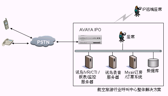 本方案采用AVAYA IP OFFICE系列交換機(jī),通過訊鳥中間件控制整個(gè)呼叫中心的電話呼入、呼出。它支持多種聯(lián)絡(luò)渠道,包括語(yǔ)音、交互式自動(dòng)語(yǔ)音應(yīng)答(IVR)、傳真、電子郵件、web、短消息等,同時(shí)利用Myair航空管理系統(tǒng)來完成整個(gè)業(yè)務(wù)流程。
