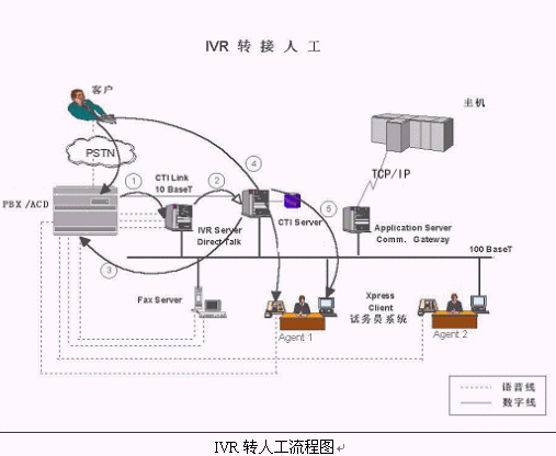 典型的客戶(hù)電話(huà)從人工服務(wù)轉(zhuǎn)接IVR的物理流程如下: