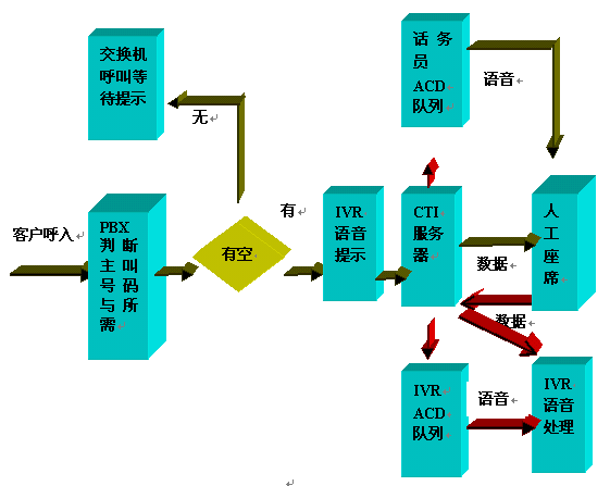 Server,CTI Server控制PBX執(zhí)行轉(zhuǎn)接任務(wù),呼叫進(jìn)入人工座席ACD隊(duì)列排隊(duì),如相關(guān)話(huà)務(wù)員有空閑,則執(zhí)行轉(zhuǎn)接操作。同時(shí)對(duì)于有些服務(wù),根據(jù)需要,CTI