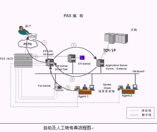 在線(xiàn)傳真(OneCallFAX),客戶(hù)用傳真機(jī)打電話(huà)到CallCenter,做過(guò)一些交易后要求傳真服務(wù),就在傳真機(jī)上按鍵切換到傳真模式,F(xiàn)AX通過(guò)同一條線(xiàn)發(fā)回,這種情況是同一通電話(huà)的在線(xiàn)傳真服務(wù)。