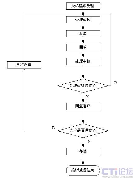 話務(wù)員確認(rèn)投訴和建議后由復(fù)審員再次確認(rèn)分析,然后把用戶的各種意見和合理化建議轉(zhuǎn)相關(guān)部門處理,對呼叫中心本身的投訴則轉(zhuǎn)班長席處理。投訴受理系統(tǒng)可以設(shè)置處理部門和處理時限,完成告警輸出和各種統(tǒng)計分析工作,投訴和建議的處理結(jié)果可以根據(jù)需要采用人工、自動、傳真、短信的形式反饋到用戶以提高用戶對服務(wù)的滿意度。