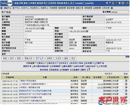 信息整合是CRM系統(tǒng)實現(xiàn)對客戶信息進(jìn)行管理的基礎(chǔ),將客戶的各類信息進(jìn)行關(guān)聯(lián),當(dāng)查詢某個客戶時,與該客戶相關(guān)的歷史接觸記錄、交易記錄都可一目了然地展現(xiàn)出來,也可以方便地進(jìn)行相關(guān)信息的及時錄入。(如下圖)