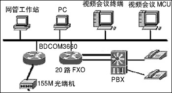通過在BDCOM3660路由器上配置相應(yīng)的CE1、語音等功能模塊,中心20個E1接口可通過SDH連接17個地市氣象局和重要的氣象站(共20個),同時可供20部電話用以VoIP通話;中心BDCOM3660路由器每臺配兩個10/100M以太網(wǎng)端口,使得數(shù)據(jù)和視頻分開,防止網(wǎng)絡(luò)的廣播風暴。