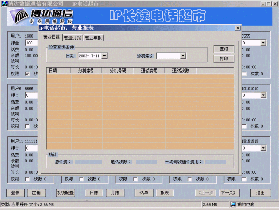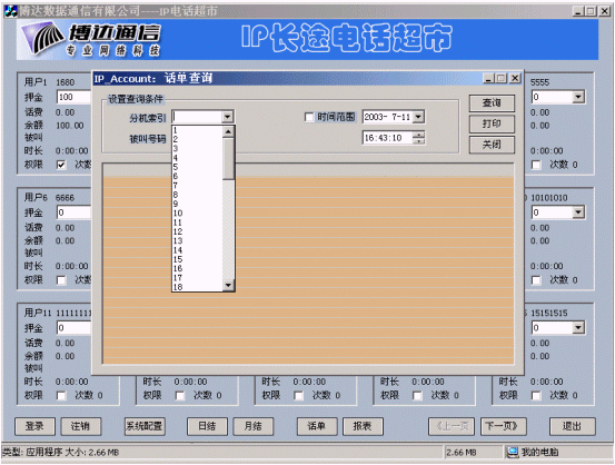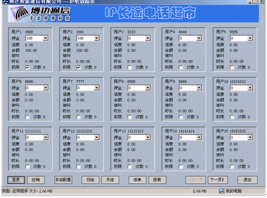 博達(dá)公司在IP電話認(rèn)證的基礎(chǔ)上開發(fā)的IP電話計費(fèi)計費(fèi)系統(tǒng),實(shí)現(xiàn)了用戶管理、卡用戶批量生成、費(fèi)率設(shè)置、折扣設(shè)置、話單查詢、帳務(wù)查詢、管理統(tǒng)計、運(yùn)營分析等功能,為電信運(yùn)營商的運(yùn)營和企業(yè)用戶對IP電話的內(nèi)部管理和服務(wù)提供了有利條件。