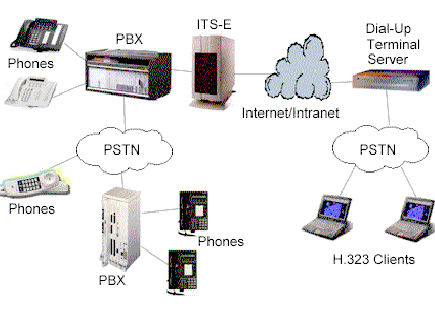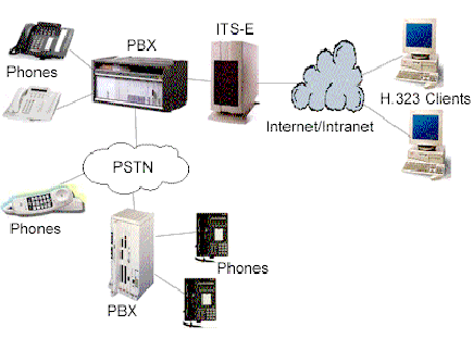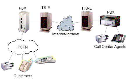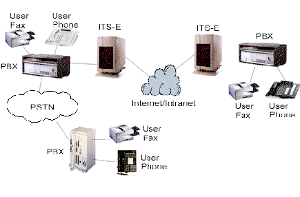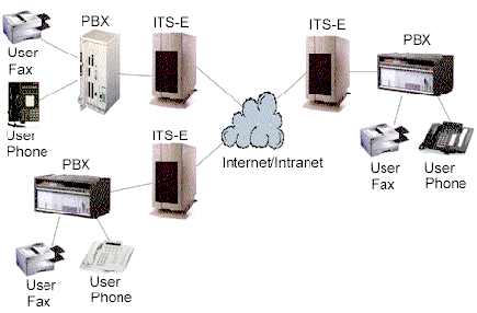 許多公司有多個辦公地點,各地之間有著頻繁的通訊往來,電話和傳真。典型地,通訊涉及到公用交換電話網(PSTN)或PBX間的私人連接路線。Internet電話服務器(ITS-E)提供了另一選擇。基本原理是一處用戶撥打的電話經本地PBX路由到本地ITS-E,本地ITS-E通過IP網絡送到目的地ITS-E,目的地ITS-E再將電話送到目的地PBX上,最后送到目的地電話或傳真機上。