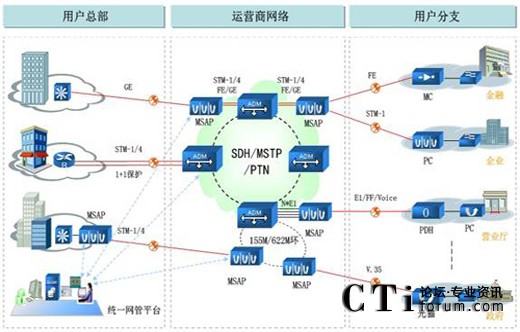 在政府、金融、能源、教育、商業(yè)連鎖等大客戶遠端機房,根據(jù)用戶不同類型的業(yè)務(數(shù)據(jù)、視頻、語音)配置相應的轉換設備,如光纖收發(fā)器、V35協(xié)議轉換器、以太網(wǎng)協(xié)議轉換器、以太網(wǎng)/E1/V35光貓、PDH等,在運營商的模塊局/基站等接入機房部署MSAP機箱并配置相對應的業(yè)務線卡,將遠端PDH、FE、V.35、語音等多種接入方式的多路業(yè)務匯聚后通過STM-1/STM-4等上行口與運營商傳輸網(wǎng)SDH/MSTP/PNT對接。在運營商中心機房,可以根據(jù)需要配置機箱式MSAP,匯聚后通過GE光纖接入用戶中心機房,也可以直接通過155M/622M/FE/GE光纖接入用戶中心機房,在用房中心機房配置MSAP進行協(xié)議還原,或直接接入用戶核心路由器的CPOS板卡上。這樣,就完成了整個專網(wǎng)業(yè)務的接入。