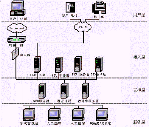 CTI服務器、IVR/FAX服務器、人工座席、管理工作站(計費、統計、系統管理、網絡管理)、數據庫服務器、WWW服務器、網絡系統等,其網絡結構圖如下:
