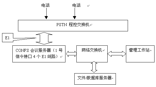 系統(tǒng)主要由網(wǎng)絡(luò)、數(shù)據(jù)庫服務(wù)器(DBS)、會議服務(wù)器(CONFS)、管理工作站幾個部分組成。數(shù)據(jù)庫服務(wù)器主要負(fù)責(zé)數(shù)據(jù)的存儲,而CONFS完成電話話路的接入與會議控制,彼此之間相輔相承。如圖所示:
