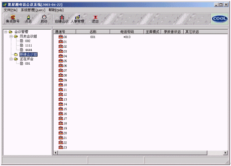 用戶接入:系統(tǒng)啟動(dòng)后,如果用戶電話呼入,則系統(tǒng)自動(dòng)接聽,并提請用戶輸入密碼校驗(yàn)后進(jìn)入會(huì)議系統(tǒng)。也可'集體撥號'、'單個(gè)撥號''點(diǎn)名'