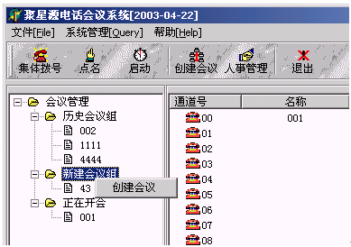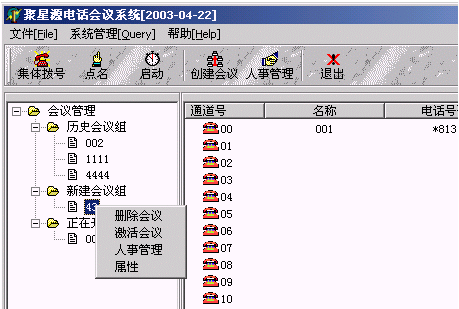 3、系統(tǒng)上方是工具欄,包括:創(chuàng)建會(huì)議、人事管理、啟動(dòng)、集體撥號、雙工/單工、點(diǎn)名、電話薄等快捷鍵。