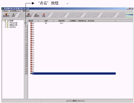 電話接入后,只能聽,不能說,通過'點(diǎn)名' 按鈕,主席可單獨(dú)和某個(gè)參加者通話。一次只能一人,確認(rèn)用戶身份,實(shí)現(xiàn)點(diǎn)名功能。