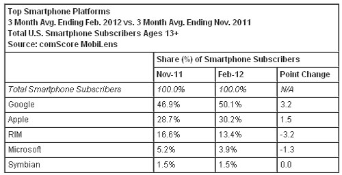 按截至今年2月份的三個(gè)月的平均數(shù)計(jì)算,美國(guó)智能手機(jī)用戶數(shù)超過(guò)1.04億人,相比截止去年11月的三個(gè)月的平均數(shù)增長(zhǎng)14%。谷歌Android操作系統(tǒng)在美國(guó)手機(jī)市場(chǎng)的份額超過(guò)50%,相比去年同期上升了17個(gè)百分點(diǎn);蘋果iOS操作系統(tǒng)排名第二,其市場(chǎng)份額為30.2%(與去年同期相比上升了5個(gè)百分點(diǎn));其后依次是RIM黑莓操作系統(tǒng)的13.4%,微軟Windows Mobile操作系統(tǒng)的3.9%,諾基亞Symbian操作系統(tǒng)的1.5%。