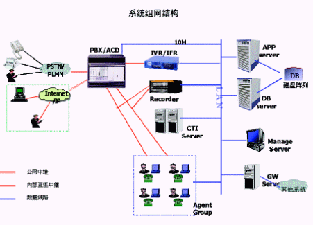 針對大型呼叫中心需求,可以推薦采用傳統(tǒng)PBX平臺呼叫中心解決方案。基本系統(tǒng)組網結構如下: