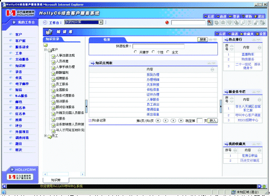 | 業(yè)務(wù)咨詢:快速查詢知識點,定位相關(guān)業(yè)務(wù)信息解答客戶。支持“關(guān)鍵字”、“個性化編碼”、“全文檢索”、“熱點排行”、“個人收藏夾”等多種信息查詢方式。 |