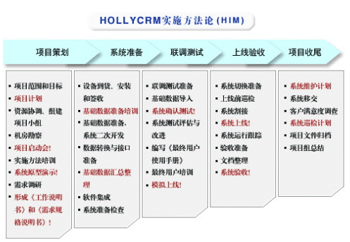 HOLLYCRM(合力金橋軟件)公司是國內(nèi)最早從事呼叫中心應(yīng)用軟件開發(fā)與服務(wù)公司,在多年的實踐經(jīng)驗基礎(chǔ)上形成了完整的“456”呼叫中心“項目實施方法論”(HIM:HOLLYCRM Implementary Methodology),即“四大實施策略、五個項目階段、六大管理專題”。該體系的有效運行對公司項目的成功上線和推進軟件產(chǎn)品的成熟將起到至關(guān)重要的作用。