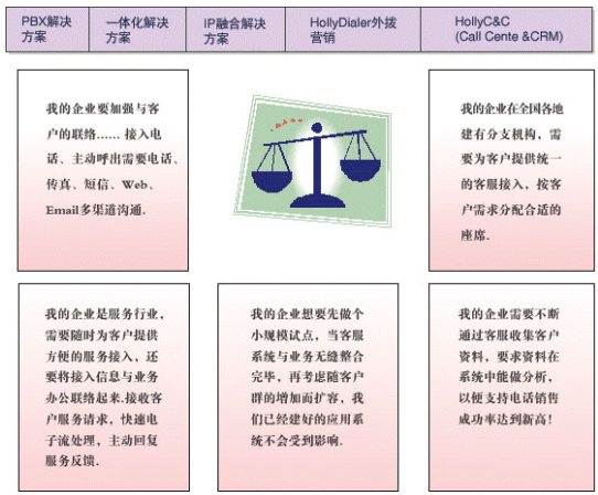 HollyC6支持的業(yè)務(wù)類型包括:客戶服務(wù)中心、咨詢熱線、電子商務(wù)中心、服務(wù)受理中心、預(yù)訂中心、電話營銷中心、技術(shù)支持中心等。
