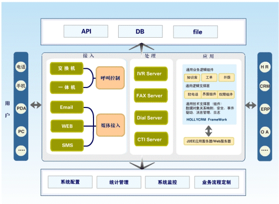 HollyC&C不僅支持電話、傳真、短信、Email、Web多媒體溝通渠道的統(tǒng)一接入和管理,還具有強大的業(yè)務(wù)整合接口,能夠幫助企業(yè)實現(xiàn)呼叫中心與企業(yè)其它信息系統(tǒng):如辦公OA、ERP、SCM、財務(wù)等系統(tǒng)的接口和工作流程整合。