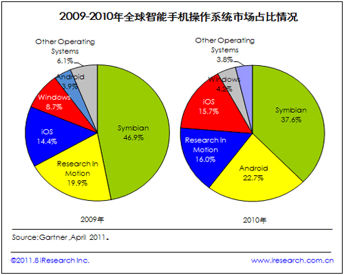 根據(jù)Gartner最新發(fā)布的數(shù)據(jù)可以看到,智能手機操作系統(tǒng)市場占比情況從2009年到2010年變化很大,Symbian仍然是占比最大的操作系統(tǒng),但是,其下降趨勢可見一斑。而Android和iOS則快速增長,2010年Android以22.7%的市場份額位列第二。經過2011年的發(fā)展,這一市場格局還將有新的變化。