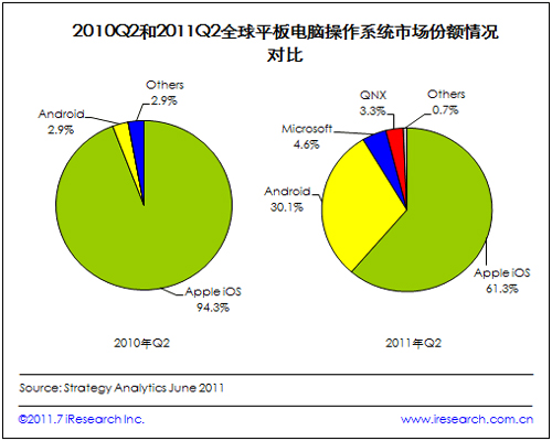 從平板電腦操作系統(tǒng)出發(fā),根據(jù)Strategy Analysis發(fā)布的數(shù)據(jù),2011Q2iOS的市場占比最大,為61.3%,其次為Android,占比為30.1%,windows以4.6%的占比位列第三。在平板電腦上,由于發(fā)展時間較短,競爭格局會比智能手機市場簡單一些。隨著市場的發(fā)展逐漸成熟,可以預見,iOS的市場份額還將進一步下降,而Android和Windows的市場占比則會上升。