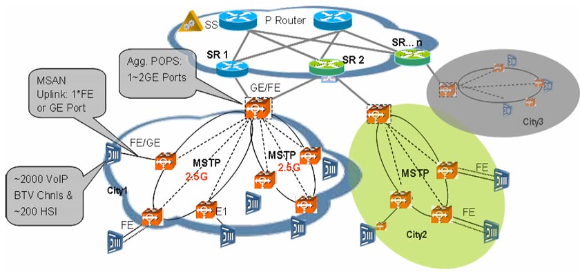 MSAN已經(jīng)逐漸成為基于IP架構(gòu)的下一代電信網(wǎng)建網(wǎng)的主要接入方式,近幾年越來越多的固網(wǎng)運營商普遍采用綜合接入(MSAN)建網(wǎng)模式,如英國的最大固網(wǎng)運營商英國電信的21CN網(wǎng)絡(luò),中國的最大固網(wǎng)運營商中國電信、中國網(wǎng)通,巴西的最大固網(wǎng)運營商Telemar等。而MSTP單一平臺具備支持MSAN接入的所有業(yè)務(wù)的承載要求,且成本最低。華為公司MSTP設(shè)備具有強大的數(shù)據(jù)接入?yún)R聚及傳送特性,并通過Metro Ethernet Forum(MEF)的認(rèn)證,成為完善地面向IP電信網(wǎng)承載網(wǎng)的解決方案。將來MSTP設(shè)備還將具有從100%基于TDM交換設(shè)備向100%基于包交換設(shè)備的演進特性,從而進一步提高了解決方案對各大運營商的吸引力。