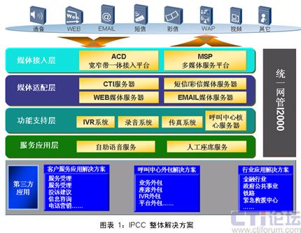 IPCC(IP聯(lián)絡(luò)中心IP Contact center)是針對(duì)金融、政府、IT和電子商務(wù)、物流、制造、緊急救援等行業(yè)的特點(diǎn),推出的一體化多媒體聯(lián)絡(luò)中心解決方案。結(jié)合電話、FAX、E-mail、Web、視頻、短信等多種通訊手段,建立客服、銷售及市場推廣的高效溝通渠道。