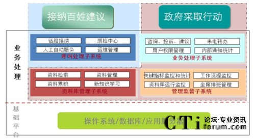 在架構(gòu)設(shè)計(jì)上,從電話接入、辦件流程、資料庫管理、信息維護(hù)到報(bào)表統(tǒng)計(jì)都實(shí)現(xiàn)了一體化設(shè)計(jì)理念。以業(yè)務(wù)流程設(shè)計(jì)為例,針對(duì)市民來電中的咨詢類的問題,12345政府熱線將直接由前臺(tái)接聽人員利用各部門預(yù)先錄入資料庫中的規(guī)范答案來回答市民的提問;對(duì)市民反映、建議、投訴類的來電,則由前臺(tái)記錄后轉(zhuǎn)給市信訪辦的后臺(tái)工作人員處理。一整套開放性的工作流和穩(wěn)定的技術(shù)后臺(tái)支持確保了市民可以在規(guī)定的時(shí)間內(nèi)得到政府的權(quán)威處理與回復(fù)。