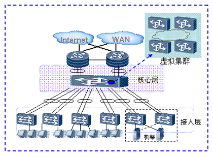 如上圖所示,整個(gè)數(shù)據(jù)中心網(wǎng)絡(luò)通過虛擬集群技術(shù),多個(gè)核心層設(shè)備虛擬為一臺(tái)設(shè)備。通過增加核心節(jié)點(diǎn),提供無阻塞的網(wǎng)絡(luò)能力,接入更多服務(wù)器。服務(wù)器的規(guī)?梢詮3000臺(tái)“無級(jí)擴(kuò)展”到數(shù)萬臺(tái)。在滿足企業(yè)日益增長的業(yè)務(wù)需求的同時(shí),并不增加網(wǎng)絡(luò)的復(fù)雜度,減少管理和維護(hù)的成本。